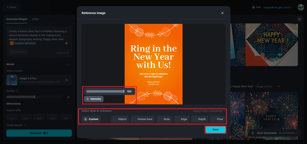 Tùy chọn, bạn có thể tải lên một hình ảnh tham khảo để truyền cảm hứng cho thiết kế. Chỉ cần nhấp vào tùy chọn tải lên và chọn một hình ảnh phù hợp với chủ đề của bạn. Sau khi xác nhận ảnh tham chiếu của bạn, hãy điều chỉnh cài đặt 'Cường độ' và chỉ định các yếu tố cần tập trung vào, chẳng hạn như Đối tượng, Kiểu, Cạnh hoặc Độ sâu. Khi bạn đã thực hiện các lựa chọn của mình, hãy nhấp vào "Lưu" để Dreamina tạo lời mời được cá nhân hóa của bạn!
